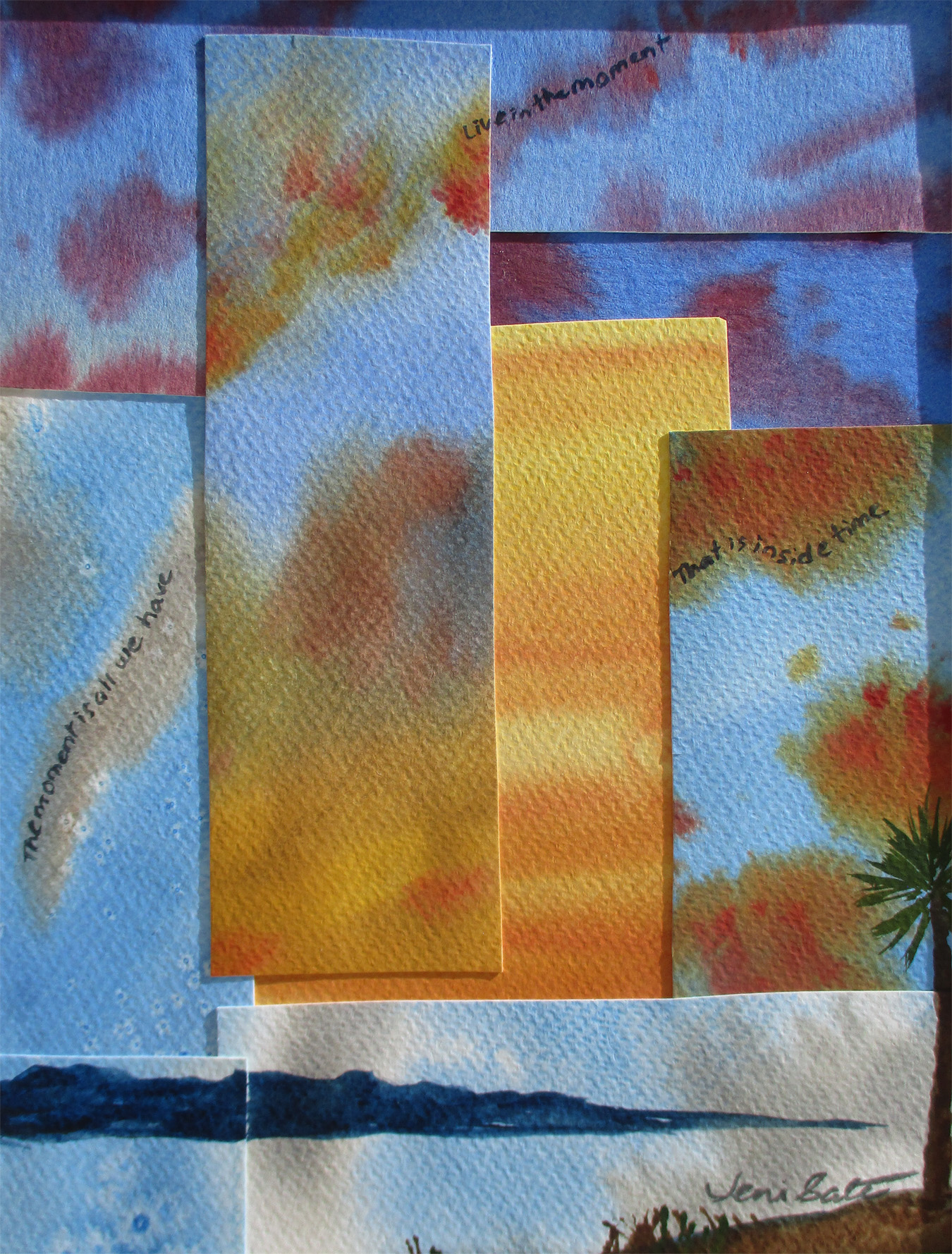 #1729 "Inside Time" 9x7" Watercolor collage in mat, frames to 11x8". $60.